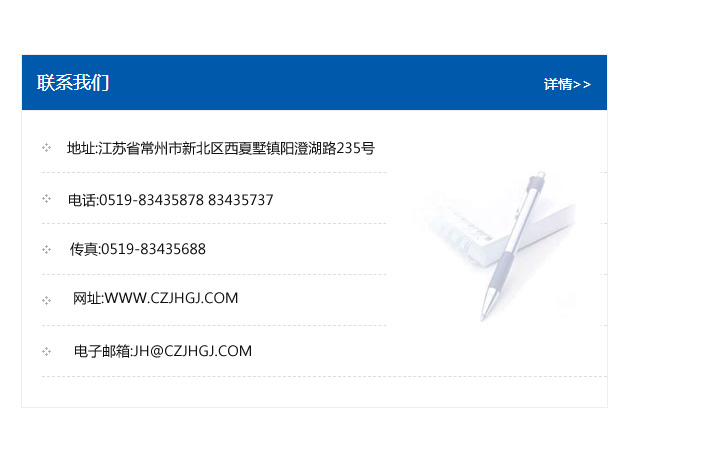 地址:常州市新北區友邦商務大廈1幢16、17層  電話:0519-85101652  傳真:0519-85112595  郵編:213022  網址:www_cz-jiayue_cn.bjhyqj.com  郵箱:xiajifengaa@163.com